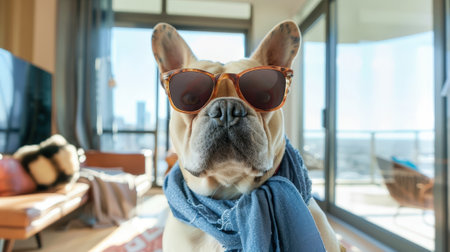 A fashionable French Bulldog wearing sunglasses and a blue scarf sits in a modern, sunlit living room with a cityscape view.