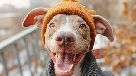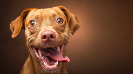 Happy smiling brown pit bull dog with open mouth and nose close-up. Concepts of joyful pet, canine happiness, outdoor adventure, friendly animal, funny puppy.