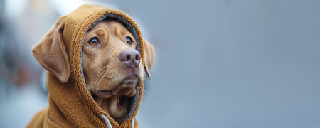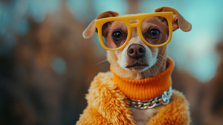 cool winter dog in jacket and sunglasses on background with copy space winter holiday concept