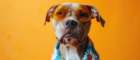 Dog in flower sunglasses and daisy shirt, bright orange background, studio shot