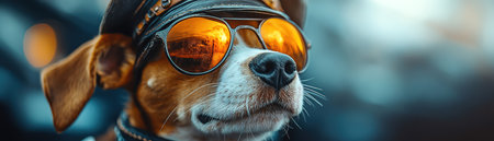 dog in sunglasses, summertime holiday concept, panoramic layout. Generative Ai