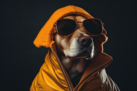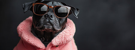 Dog in pink coat and sunglasses, dark background, fashionable and chic