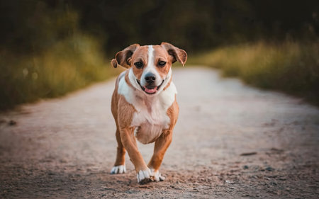 A friendly dog pauses amidst the vibrant streets of a lively town, soaking in the warm hues of a setting sun. Its expressive eyes reflect curiosity and joy as it explores the bustling environment.