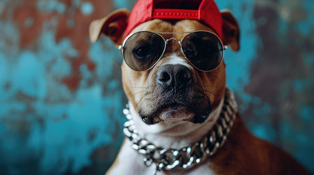 American Staffordshire Terrier Dog in a red cap and sunglasses