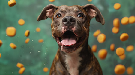 A cheerful pitbull sits with an expressive, happy face as tasty treats rain down around it. The dog exudes pure joy in a lively green backdrop, capturing a playful moment.