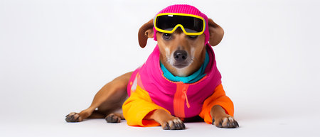 Creative animal concept. dog in a group, vibrant bright fashionable outfits isolated on solid background advertisement, copy text space Ai generated