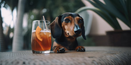Dachshund dog is on summer vacation at seaside resort and relaxing rest on summer beach of Hawaii
