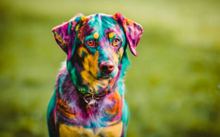 Group of three dogs in colorful raincoat and sunglasses on a colorful background