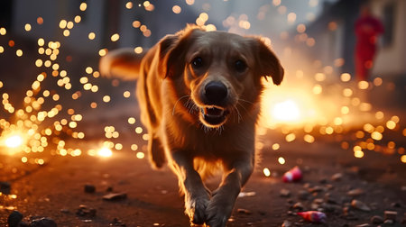Dog running towards the camera with sparkling lights in the background at dusk.