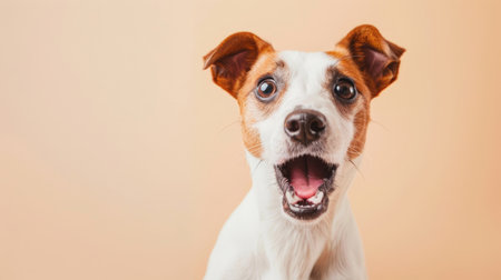 Close up of Funny Dog with wide eyes and open mouth expressing surprise or curiosity. A white background highlights the dogs bright coat and expressive face