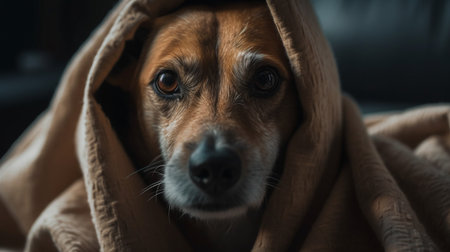 Portrait of a dog with a blanket on his head in the dark. generative ai