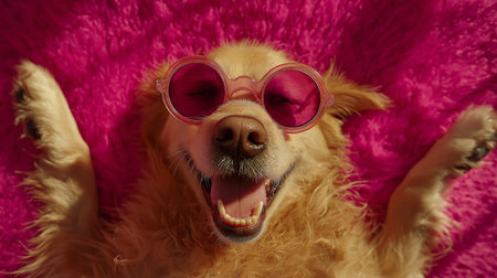 Funny golden retriever dog in pink sunglasses lying on a pink blanket