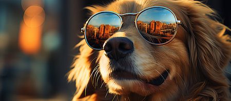 Portrait of a Golden Retriever dog in sunglasses with city background.