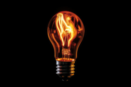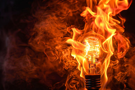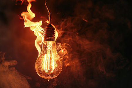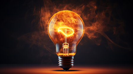 Lightbulb with a fiery filament surrounded by smoke, symbolizing burning ideas or energy AI