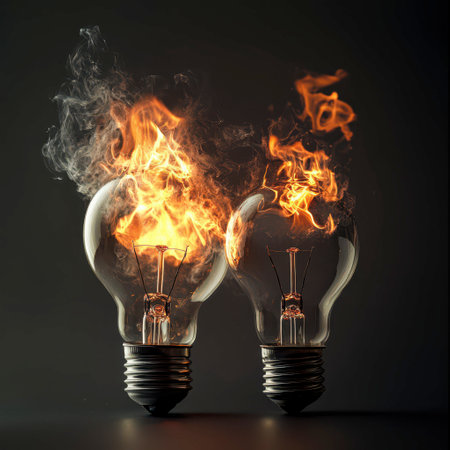 Two light bulbs erupt in flames, casting glow and shadows in a dark environment. The contrasting elements of light and fire create a striking visual impact.