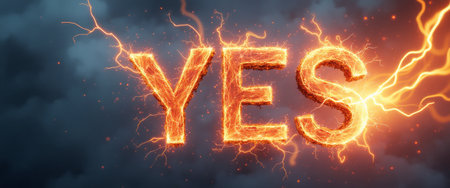 A bold and dynamic YES bursts forth in fiery orange hues, surrounded by crackling energy and dark stormy clouds. This striking image conveys a powerful sense of affirmation and enthusiasm, igniting a feeling of excitement and positivity.