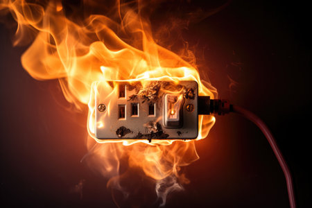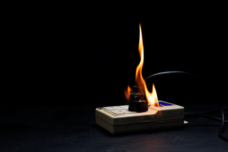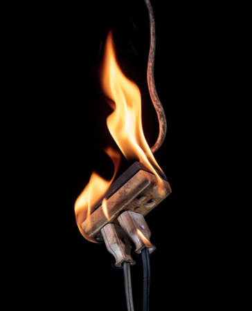 Electrical short circuit The socket or electronic device has caught fire. Using a substandard plug or cord on a black background