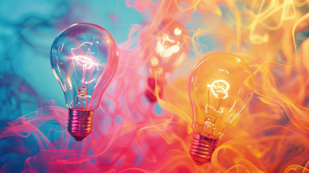 Illuminated light bulb in vibrant pink and blue smoke, close-up view. Creativity and inspiration concept
