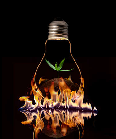 A light bulb with fresh green leaves inside on the fire, isolated on black