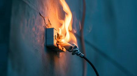 An electrical plug fire is caused by a short circuit of electrical current. Concept of prevention of danger. Using non-standard equipment, damaged equipment