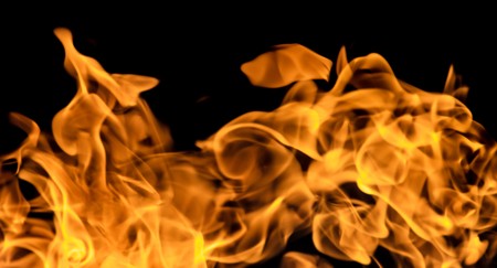 Dynamic flames rising against a dark black background, creating a dramatic contrast between the glowing fire and shadow