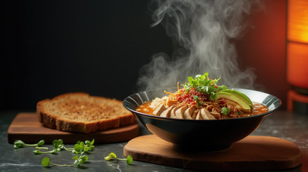 A steaming bowl of spicy soup filled with noodles and vibrant toppings sits on a wooden cutting board next to a slice of toasted bread. The warm, inviting ambiance enhances the meal's appeal.