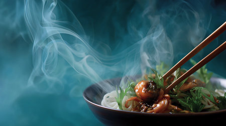 A steaming bowl of flavorful Asian noodles garnished with fresh herbs brings an inviting and appetizing touch to any dining experience.
