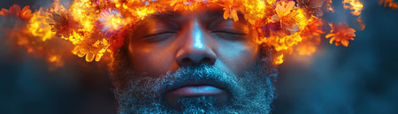 Man with a colorful beard and flower crown, vibrant and playful atmosphere
