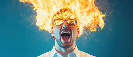 A man in a business suit with his head exploding into flames, symbolizing stress or burnout, set against a smoky background.