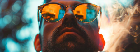 Close-up portrait of a stylish man wearing reflective sunglasses with orange-tinted lenses, highlighting the vibrant colors and his confident expression, with a blurred background.