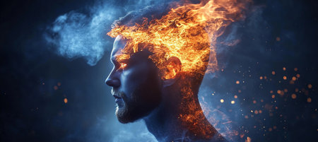 Burning Inspiration, Profile of a Bearded Man with Flames and Smoke in an Artistic Portrait
