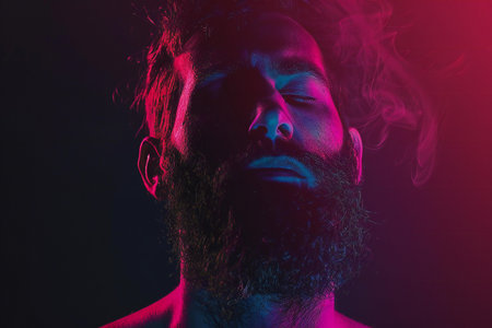 A mans face is illuminated by blue and pink light, creating a dramatic effect