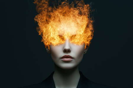 A powerful portrait of a woman enveloped in fiery orange smoke, exuding mystery and intensity under dramatic lighting.