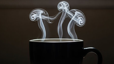 An image captures a black coffee mug releasing curling wisps of vapor. The smoke rises, forming abstract shapes against a dark backdrop. The composition features a close-up perspective with selective focus. The image's clean lines and contrast make it suitable for various commercial uses related to beverages or relaxation.