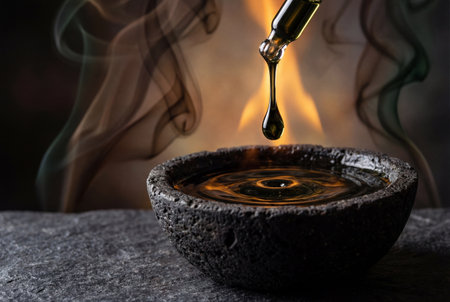 A golden drop of essential oil falls from a glass pipette into a textured stone bowl filled with liquid while dramatic smoke and orange flames swirl in the dark background.