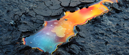 Rainbow-Hued Hazard: Colorful Gasoline Spill on Asphalt. Concept Colorful Spill, Hazardous Materials, Rainbow Colors, Environmental Contamination, Asphalt Cleanup