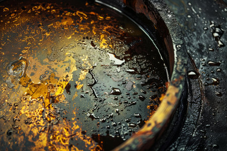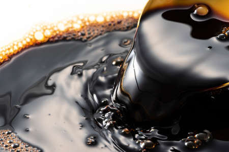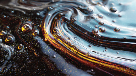 Glossy crude oil showcases black liquid with reflective surfaces and bubbles, embodying petroleums essence for industrial use.