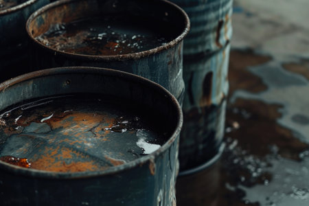 A thick, black substance, resembling crude oil or industrial waste, oozes down the side of a corroded yellow barrel. The stark contrast between the bright, decaying drum and the dark spill highlights themes of pollution, environmental neglect, and the hazardous byproducts of industry.