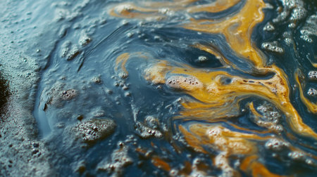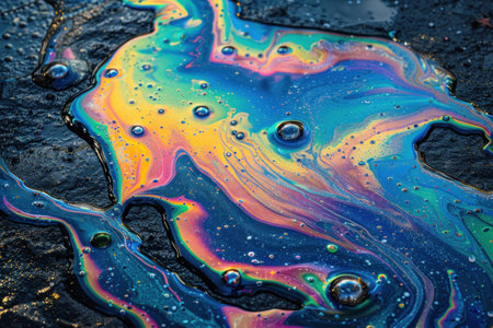 Colorful oil slick on wet surface creating vibrant abstract patterns and reflections. Environmental pollution concept with bright blues, purples, and greens.