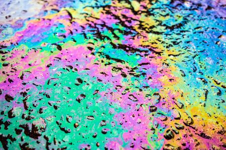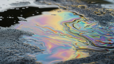 Rainbow oil spill on wet asphalt surface creating colorful pollution texture and abstract background