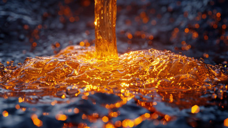 A captivating scene showcasing a golden liquid pouring from a bottle, creating a stunning splash against a dark background. Ideal for dynamic beverage themes.
