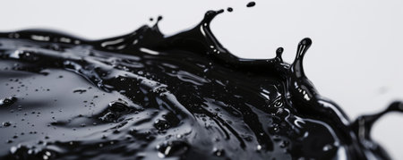 A captivating close-up image of black liquid splashing on a dark surface, featuring glowing highlights. The dynamic motion creates a dramatic effect.