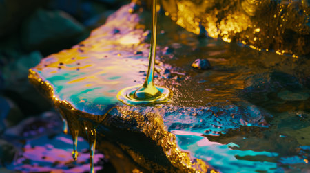 Yellow Fluid Stream Cascading Over an Abyss with Oily Background and Viscous Liquid Effects