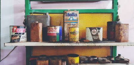 Ratchaburi, Thailand - September 26, 2018: Many old rusty tank and engine oil can putting on shelf. Set of vintage object and collection.