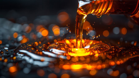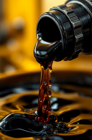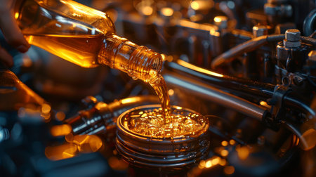 A shot of fresh engine oil being poured from a bottle into an engine during an oil change, with light highlighting the shiny surface of the oil
