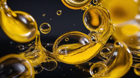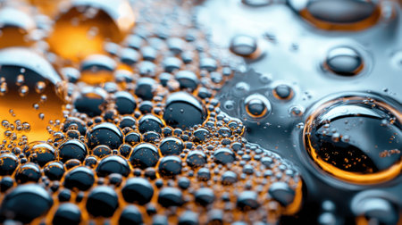This image captures golden liquid bubbles of varying sizes suspended on a dark reflective surface, presenting an intriguing interplay of light and fluid dynamics, evoking a sense of wonder and beauty. AI generated image