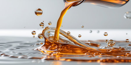 close-up shot of motorcycle motor oil flowing smoothly from the neck of the bottle, showing the designed precision and quality of the liquid for engine care.