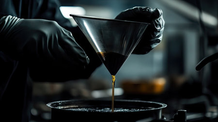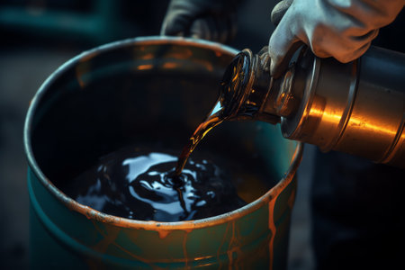 Pouring oil into an engine in an industrial setting with warm lighting and machinery in the background