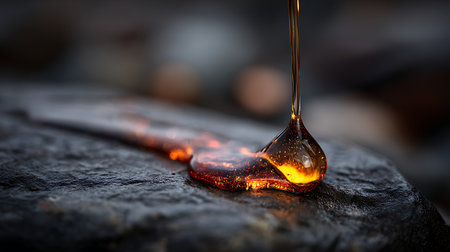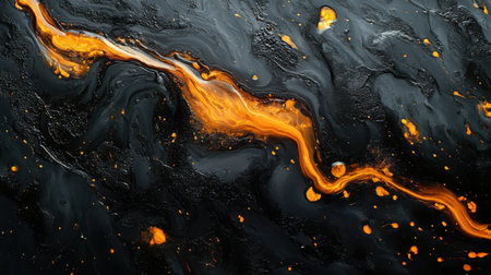 Golden Viscous Liquid Flowing Over Obsidian Surface Creating Artistic Reflections and Pools