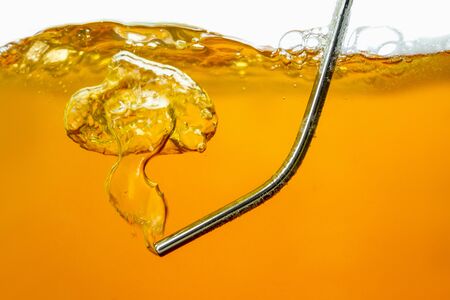 Closeup bubble is blown out of metal steel tube, dipping into green tea. Macro shot of waves, splashes in glass with lager beer, whiskey, cognac, rum, lemonade. Cold alcohol beverages, hot drinks.